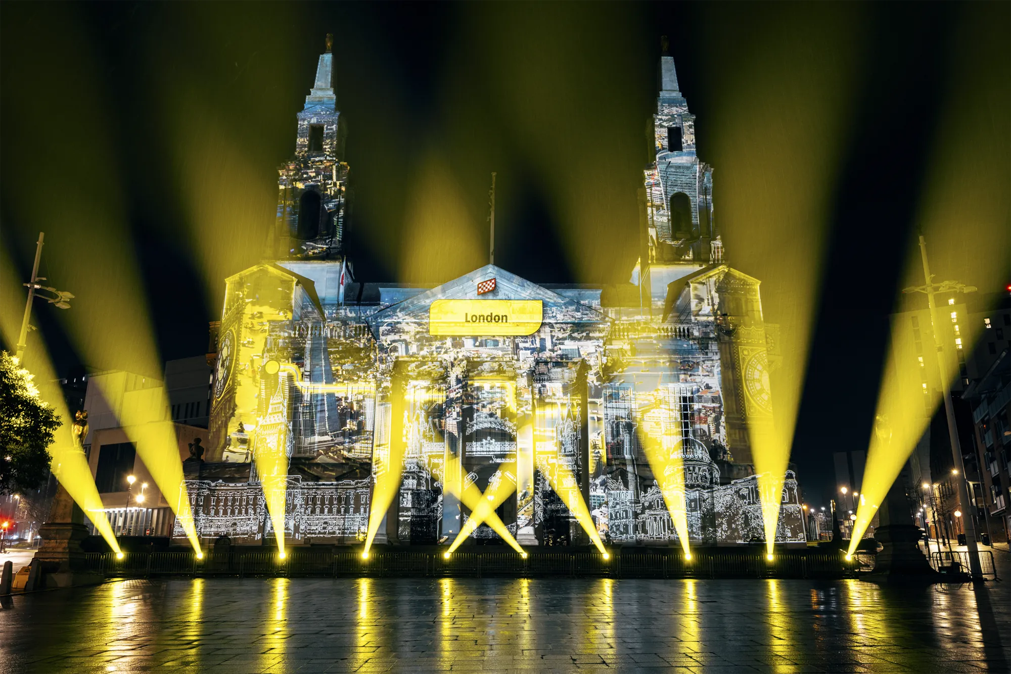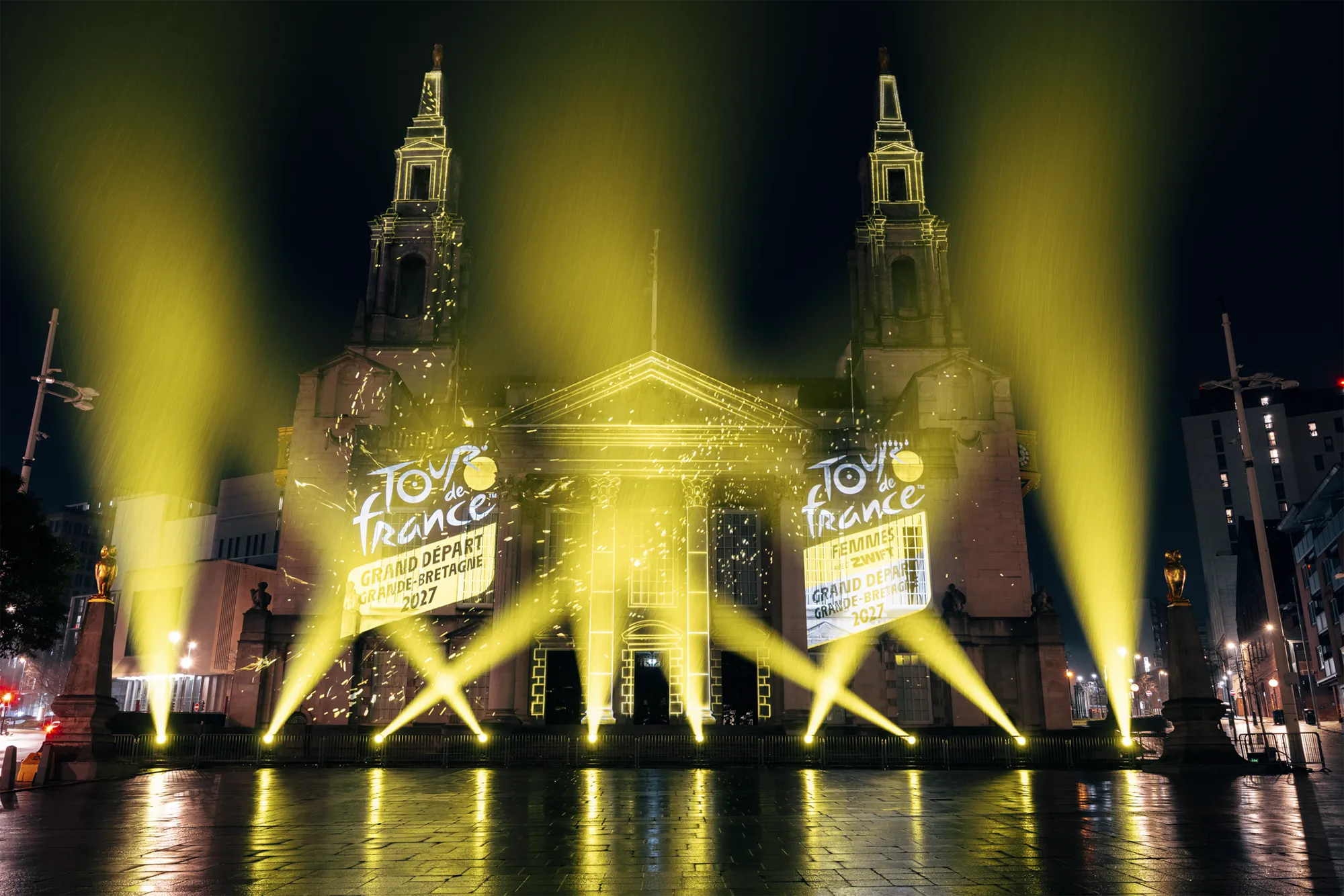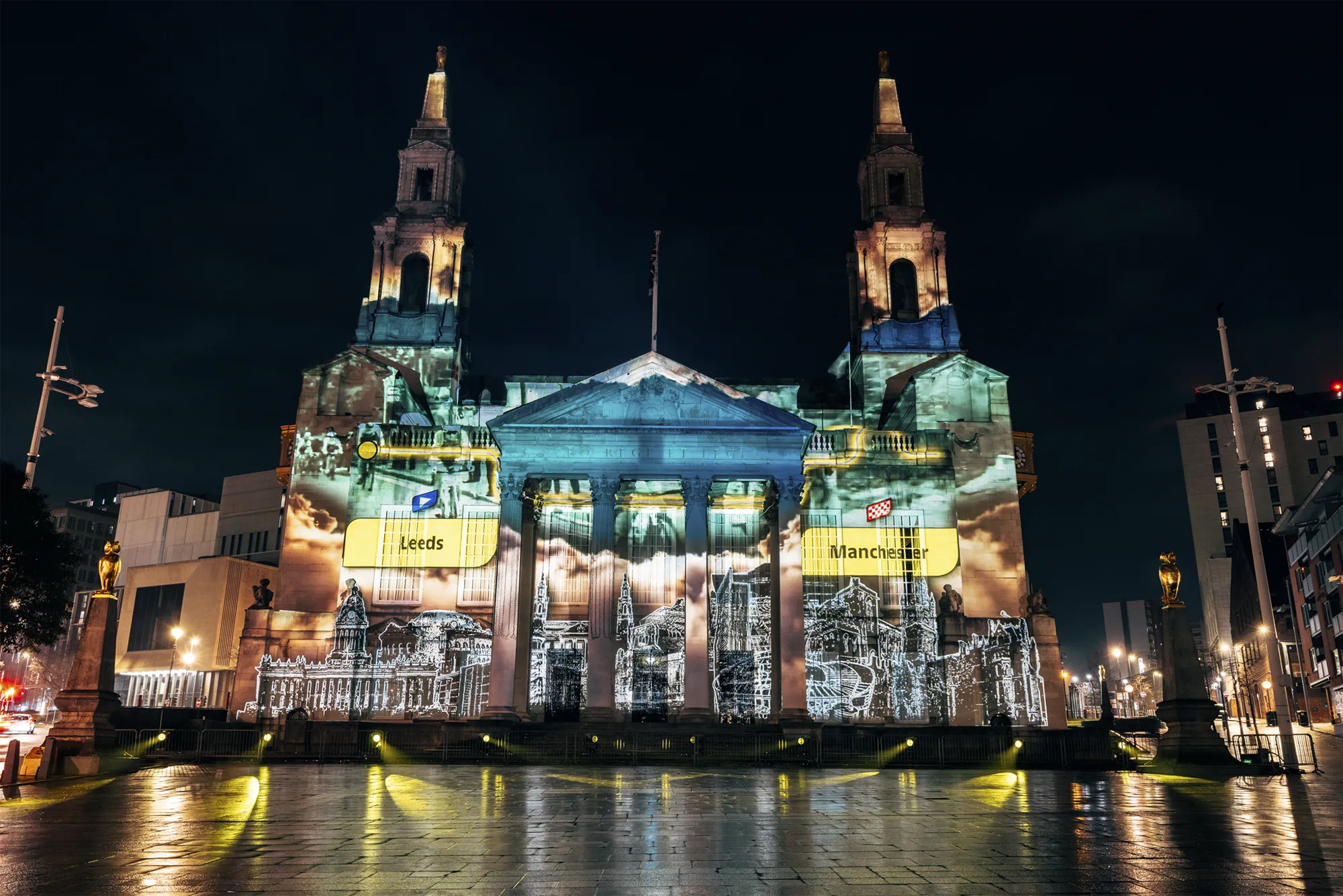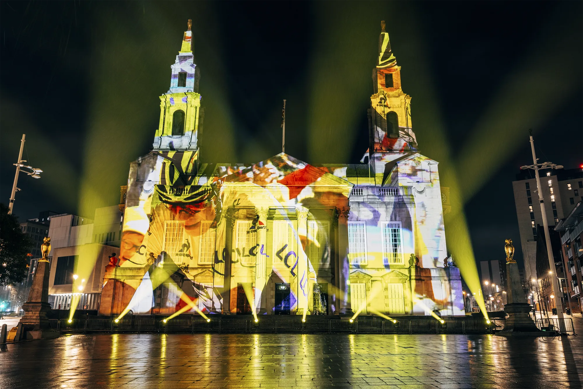 Working closely with stakeholders, we turned the façade of Leeds Civic Hall into a striking projection canvas, showcasing a dynamic visual narrative that celebrated previous British Grand Départs while unveiling the newly announced 2027 routes. A bespoke highlight film, narrated by Olympic medallist Lizzie Deignan, brought over a century of cycling history to life, connecting audiences with the scale, emotion and legacy of the Tour. Carefully choreographed content combined archival references, contemporary visuals and bold graphic moments, ensuring the story unfolded with clarity and impact. The experience culminated in the reveal of bold, 15-metre Tour de France logos, anchoring the moment in a strong and memorable visual identity that could be clearly read across the square.