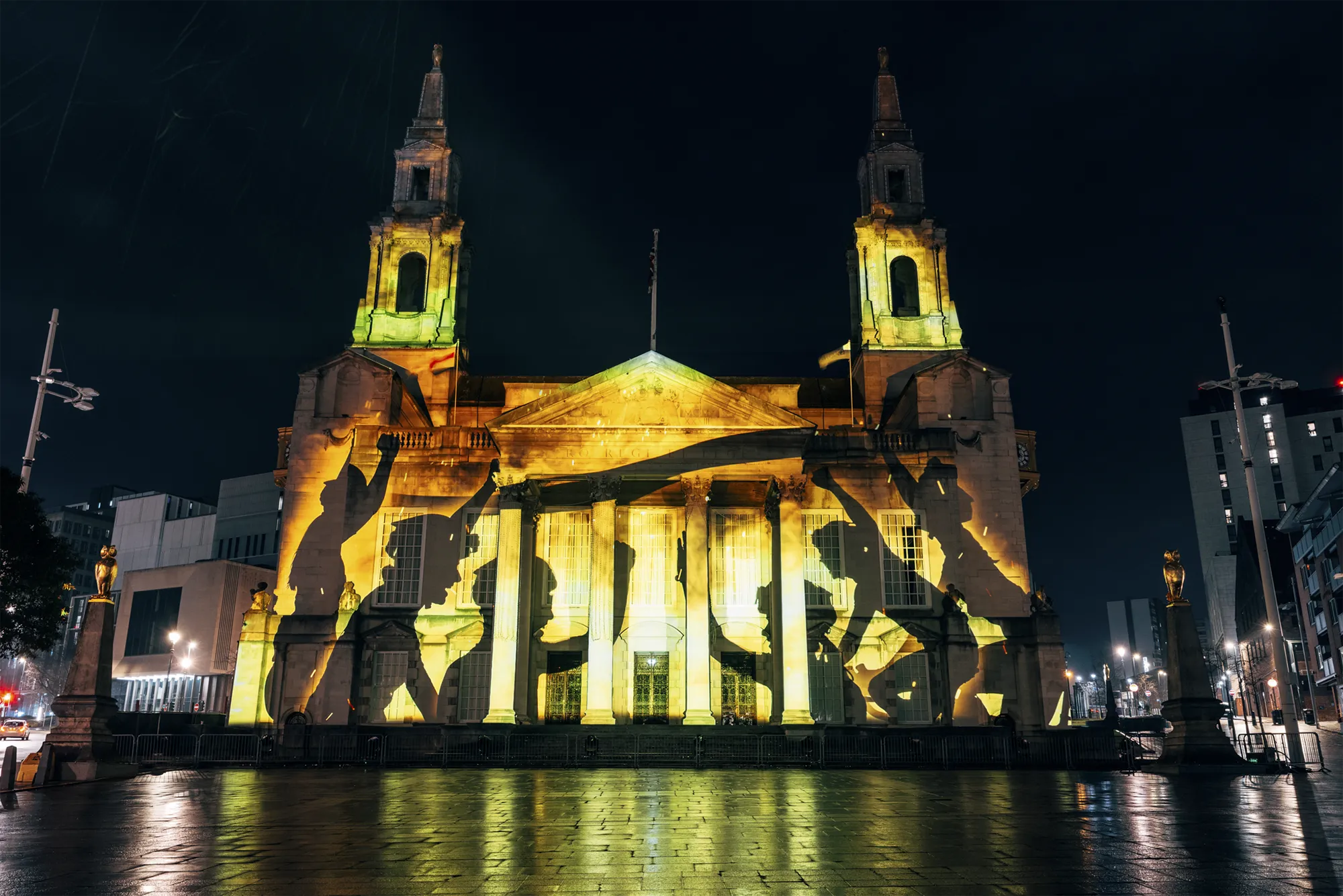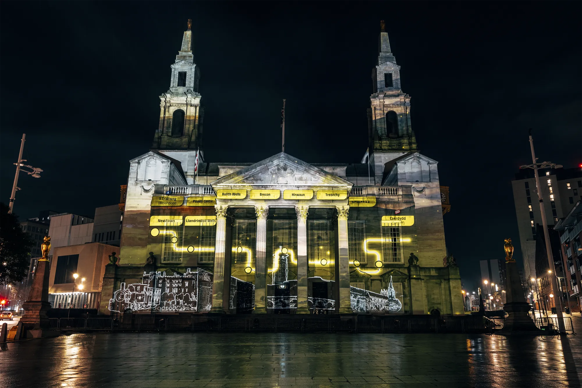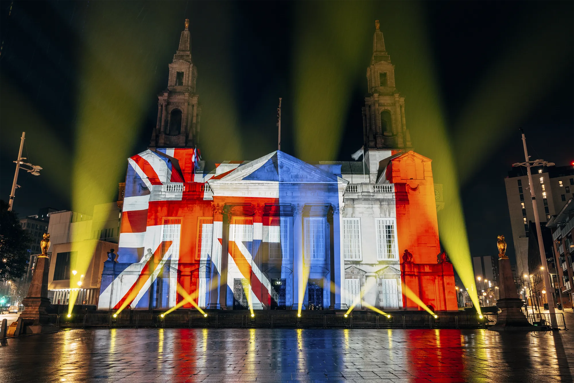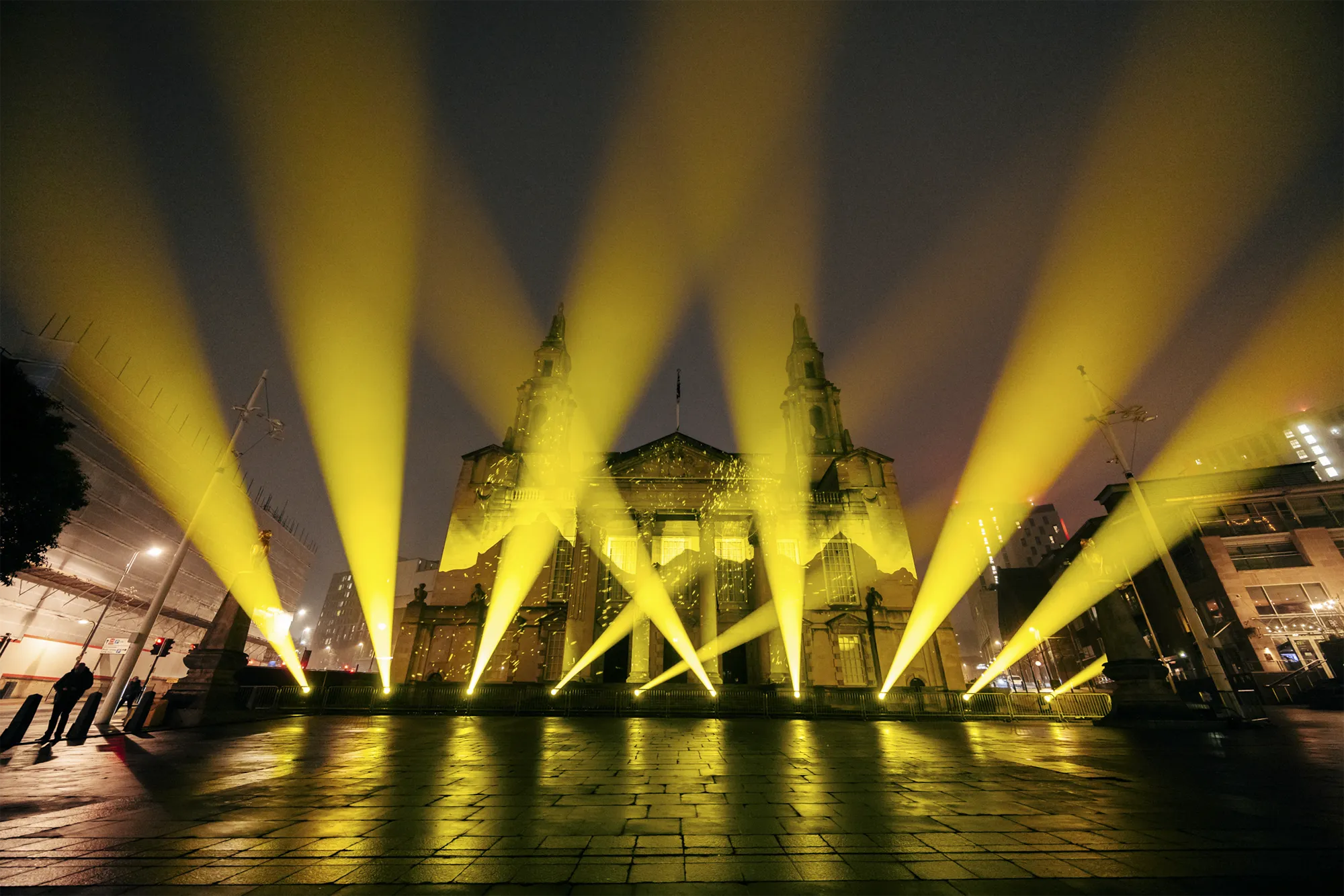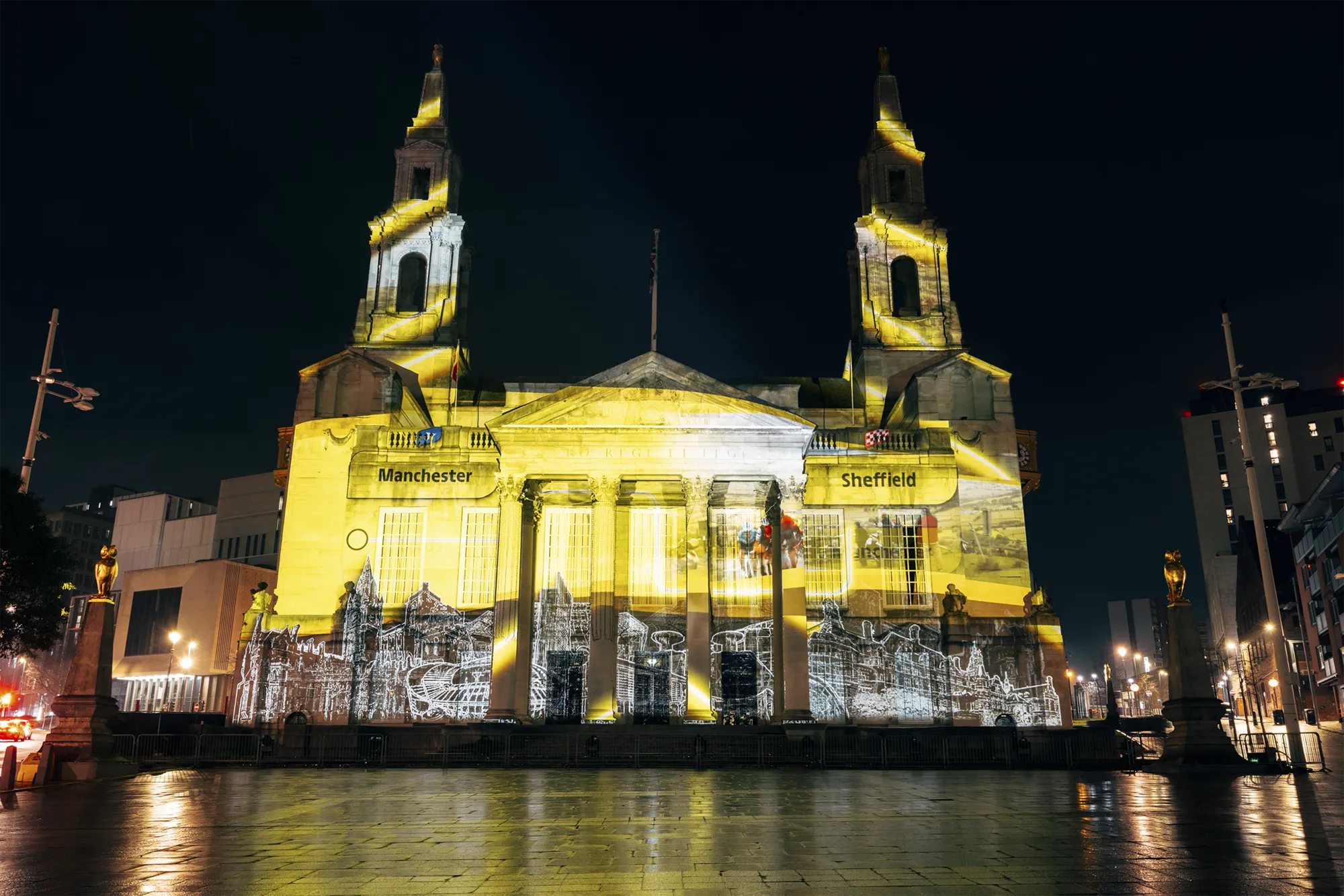 Working closely with stakeholders, we turned the façade of Leeds Civic Hall into a striking projection canvas, showcasing a dynamic visual narrative that celebrated previous British Grand Départs while unveiling the newly announced 2027 routes. A bespoke highlight film, narrated by Olympic medallist Lizzie Deignan, brought over a century of cycling history to life, connecting audiences with the scale, emotion and legacy of the Tour. Carefully choreographed content combined archival references, contemporary visuals and bold graphic moments, ensuring the story unfolded with clarity and impact. The experience culminated in the reveal of bold, 15-metre Tour de France logos, anchoring the moment in a strong and memorable visual identity that could be clearly read across the square.